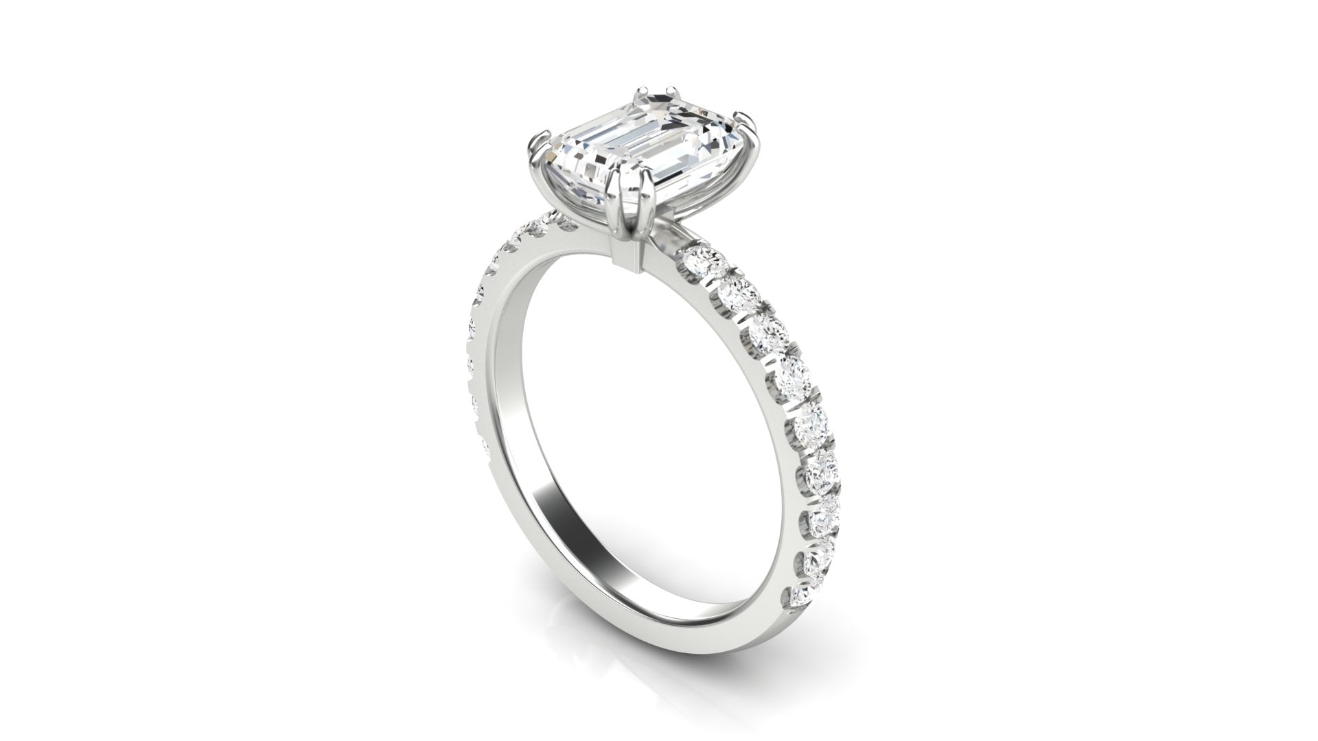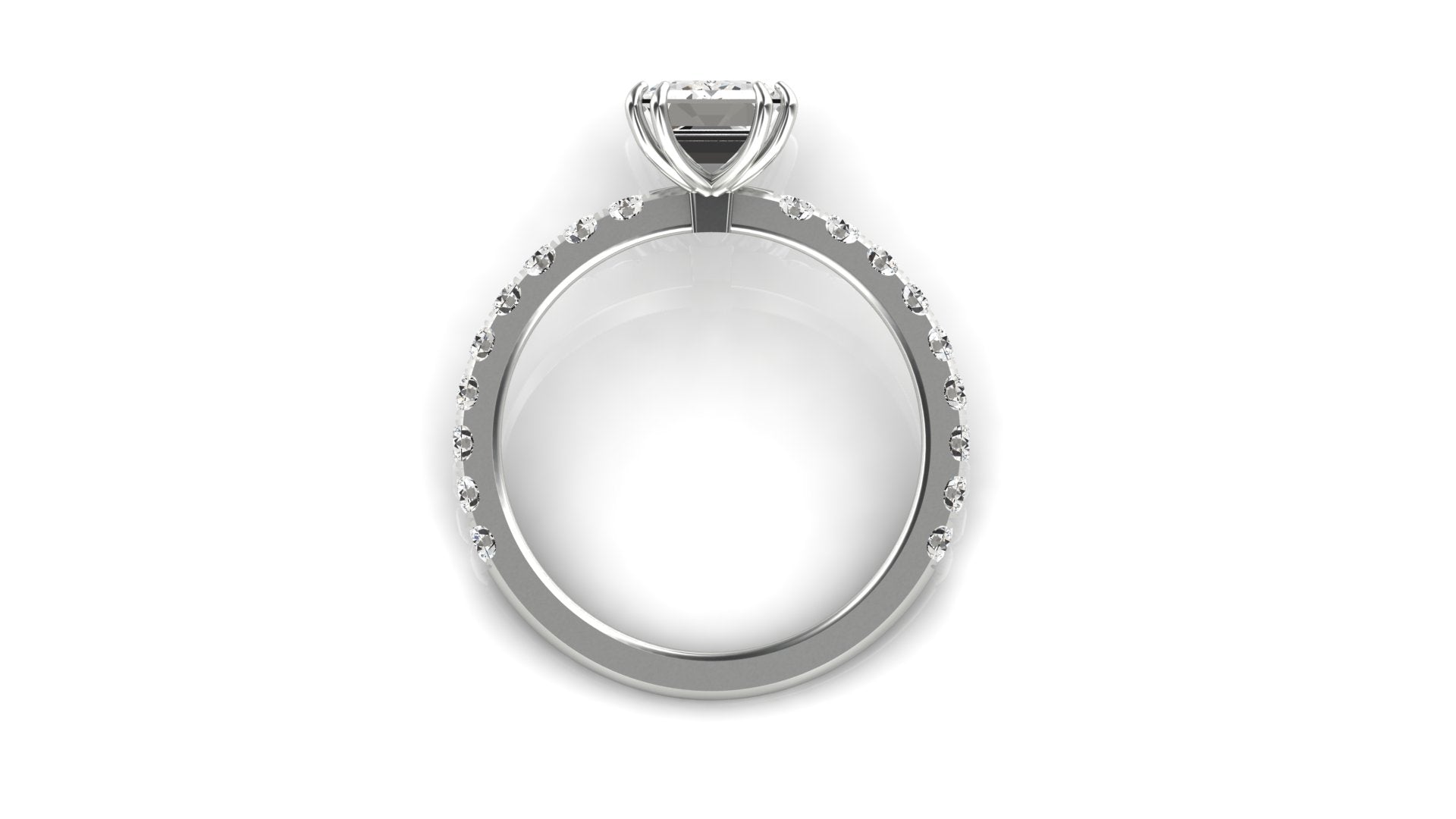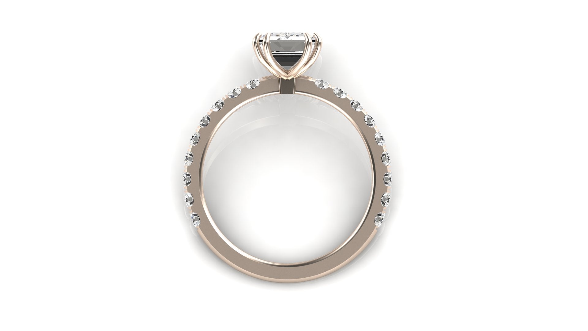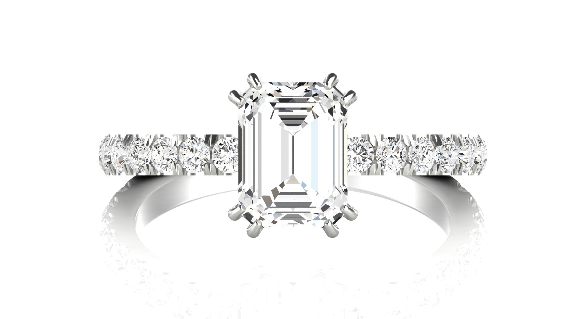 The Antoinetta Ring features a 8x6mm Emerald Cut Moissanite (D-F color) center stone with 18-2.0mm round brilliant cut diamonds set securely with 4 prongs down the sides.